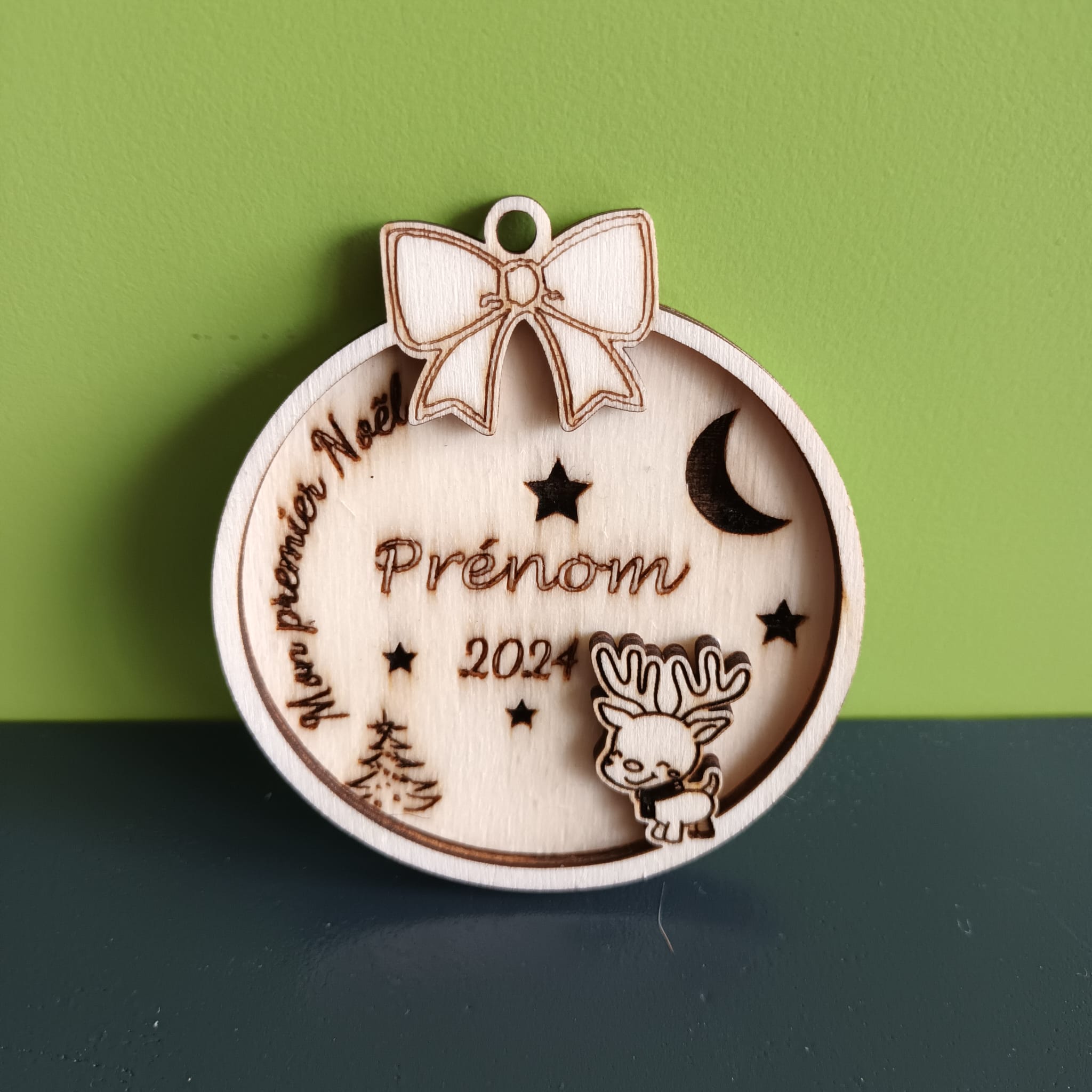 La boule « 1er Noël » est gravée au laser avec le prénom de bébé et l’année de naissance. C’est un cadeau de naissance ou de baptême qui prendra place chaque année sur le sapin et deviendra un souvenir familial précieux. Contactez-moi pour la personnalisation avant de commander.